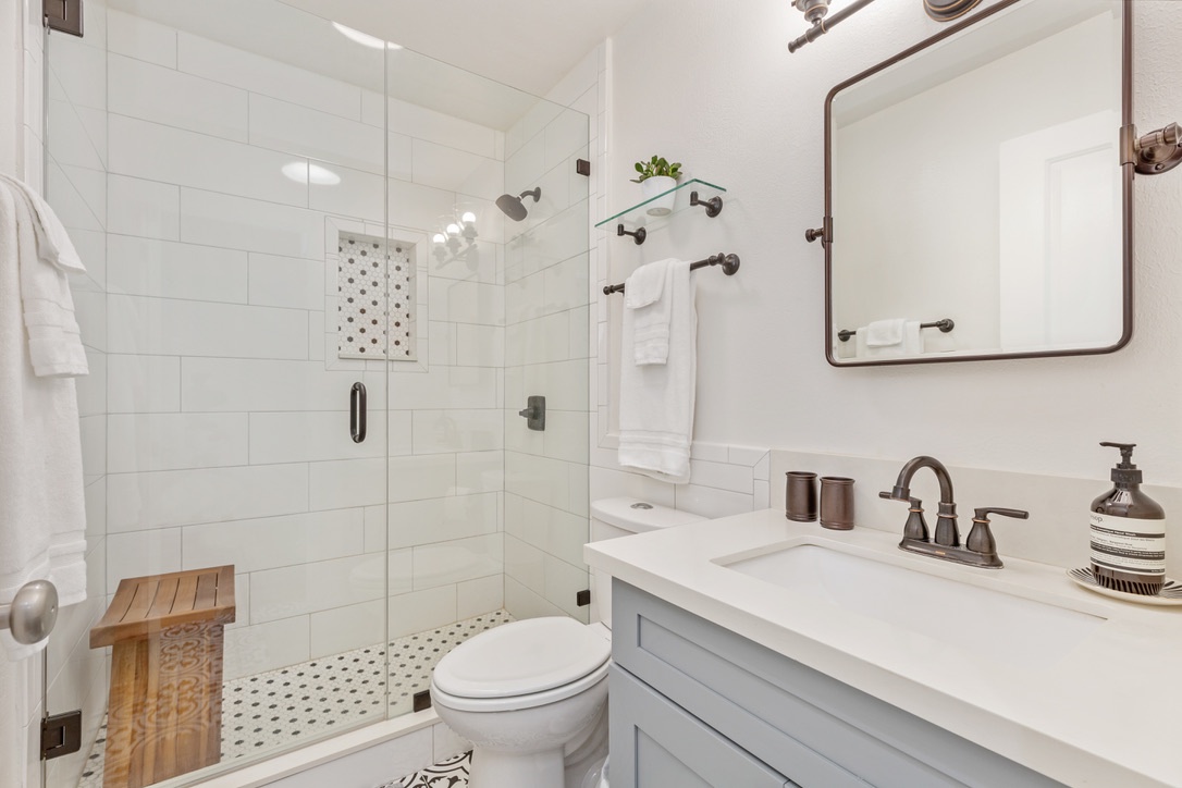 The full bathroom is thoughtfully designed with all the amenities you need for a convenient stay. Fresh towels, toiletries, and a hairdryer are provided for your comfort.