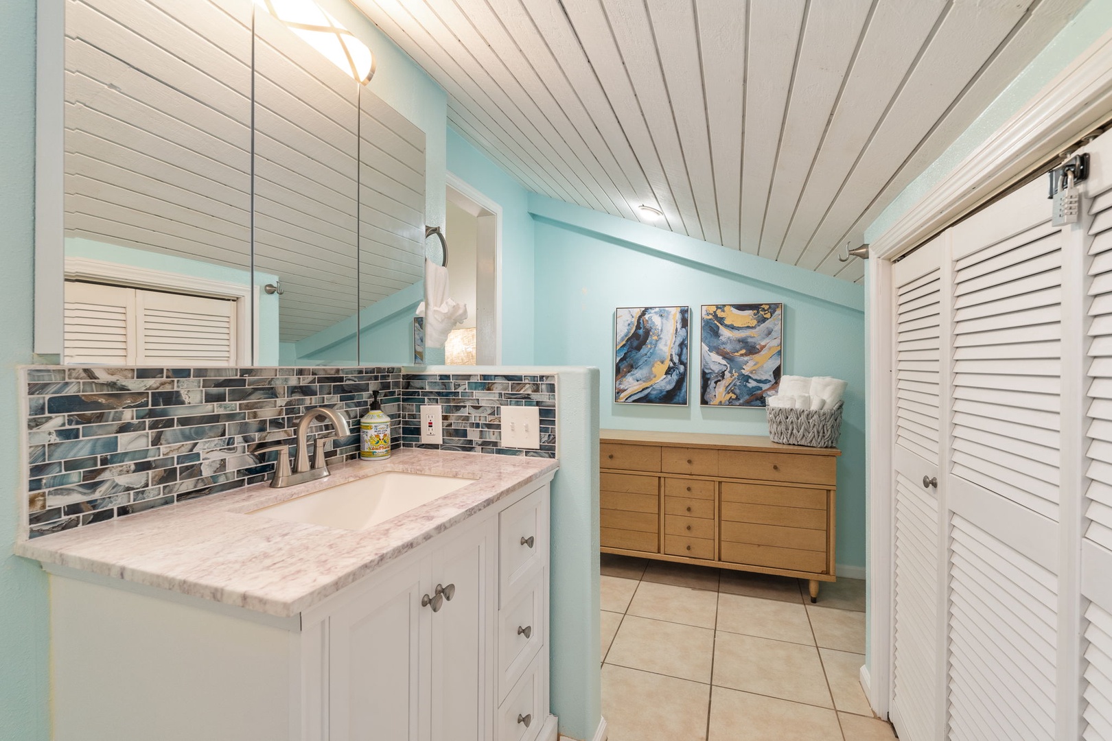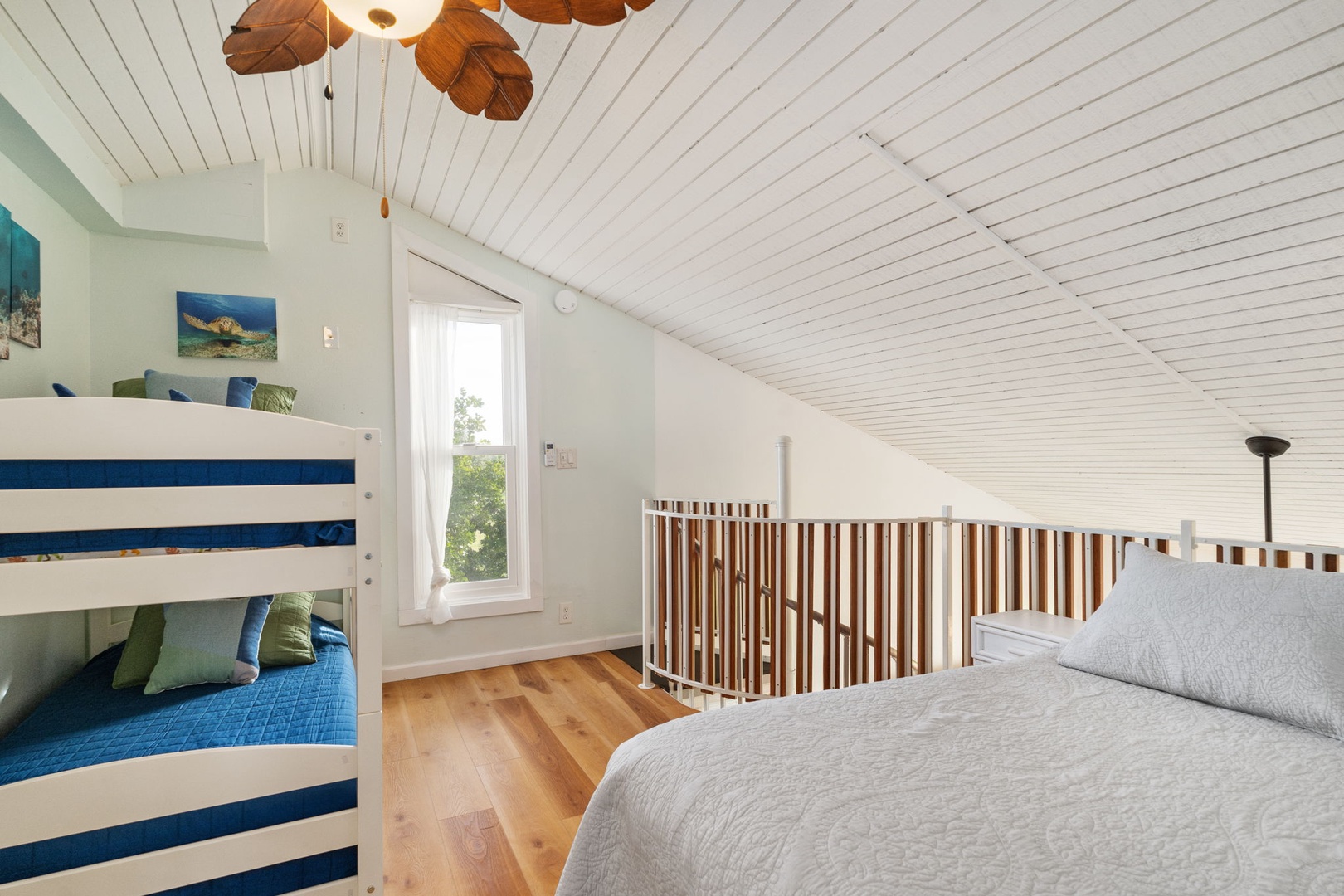 Upstairs, you'll find a loft bedroom with a queen bed and twin bunks, providing ample sleeping arrangements for everyone. The upstairs full bathroom offers additional convenience, and the shared living space includes a comfortable seating area with a Smart TV and high-speed WiFi, ideal for relaxing after a day of exploring.